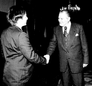 President Patricio Aylwin of Chile greets researcher Eduardo Vera.