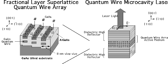 We used a different approach. When a GaAs crystal is cut slightly off one of its crystallographic orientations, a staircase-like pattern of regularly spaced nanometer-size steps naturally forms. We were able to grow layers of aluminum arsenide (AlAs) and gallium arsenide (GaAs) crystals, less than a monolayer in thickness, on top of the steps using chemical vapor deposition (CVD) growth technology. Using this technique, we succeeded in producing nanometer-order GaAs quantum wires. We call structures grown in this way fractional-layer superlattices.The deposition technique is unique in that it can create densely-packed quantum wires that can be precisely integrated into microcavity laser structures. The figure shows how the quantum wires are formed and how they fit into the microcavity laser structure.