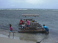この「いかだ」はなかなかイカス。12畳はあるだろうか。波が来ても安定しているのだ。海の上でプカプカしていたいと誰しもが思う人間の夢を見事に実現している。巨大な竹が足に心地よく、一日中青竹踏みをしていようなもんで、頭から足まで最高!