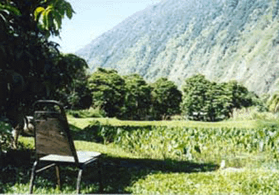 まるで「風の谷のナウシカ」の世界。この椅子に座ってしばし、ぼぉ〜っとして、私も風になりました。左の写真、遠くに人がいるのがわかりますか。タロイモを栽培してるんですね。タロイモは、きれいな澄んだ水がないと育たないそうです。彼らハワイアンは自給自足をしてるそうです。