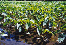 そして右の写真がタロイモの葉。根は大きなジャガイモくらいで、質感は里芋ですかね。今回は陸・海・空のすべての乗り物を駆使したんですが、左が空部門のヘリコプター。空からハワイ島を見ると火山の噴火あり、海の青さあり、風の谷のナウシカの世界ありで、2時間の飛行があっと言う間でしたよ。そして谷はまさに大地の裂け目だという事がわかります。