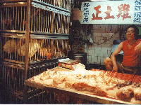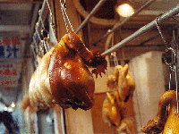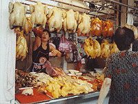 ニワトリが生きたまま檻に入ってます。毛をとったニワトリは吊されます。