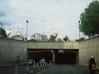 | これはおまけ。 ダイアナさんが激突したトンネル。 激突したその場所は、誰にでも分かるように、トンネル内の事故現場のま上に金のオブジェが建てられて、場所の目印になっているんです。 なんでも観光にしてしまうのがパリ。 俗っぽくならないように祈りたいですね。